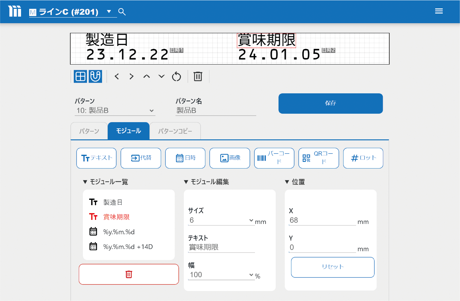 印字内容の編集やパターン管理をといった各種操作は、専用アプリで行ないます。最大100種類のパターンを登録できます。
