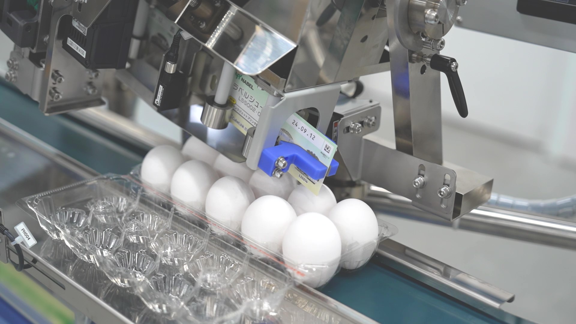卵パックの天面に貼り付ける上貼りラベルに賞味期限を印字した事例。上貼りラベルの材質はポリプロピレンです。