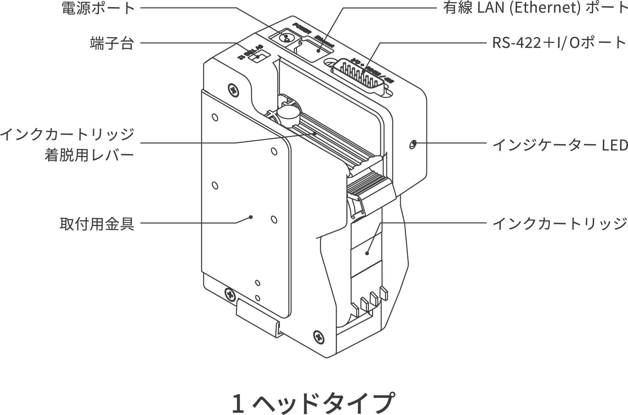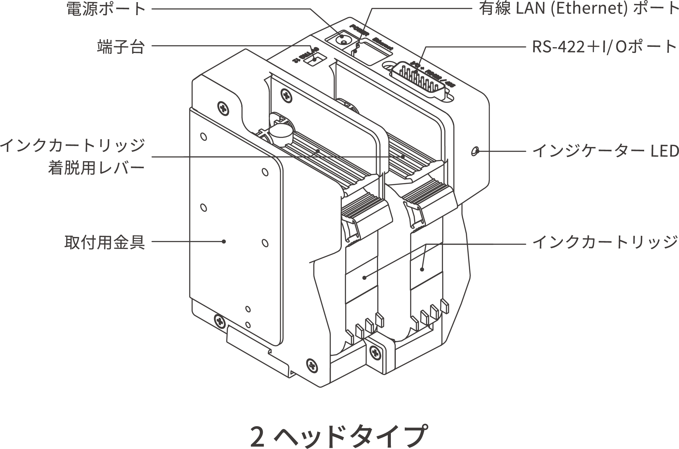 | 印字範囲 ※6 | ・1ヘッドタイプ 1536×150ドット (130×12.7mm) ・2ヘッドタイプ 1536×300ドット (130×25mm) ・2ヘッドロングタイプ 3072×300ドット (260×25mm) |